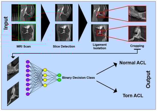 Simplified schematic representation of a multilayer convolutional neural network for detecting anterior cruciate ligament injuries on MRI images. Single images from different views of complete MRI datasets serve as input. In the first step, relevant slices containing the ACL are identified. Next, the specific image region containing only the ACL is isolated and cropped. The processed images are then passed through multiple network layers for classification. In a binary classification model, the output can be, e.g., “Normal ACL” or “Torn ACL”.