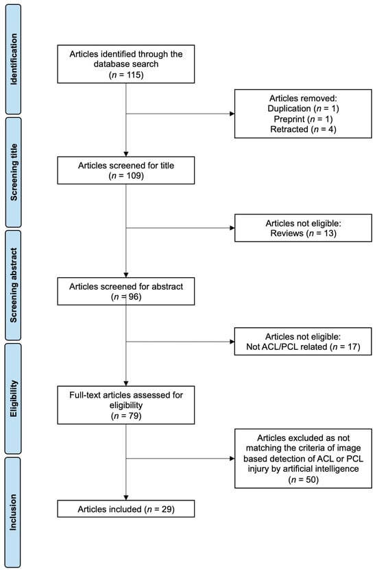 The literature search resulted in 115 articles. After screening, 29 articles fulfilled all inclusion criteria (Table 1 and Table 2, Figure 2). Of note, the search strategy did not include any restrictions on publication date. However, no relevant studies were published before 2017. Among the identified publications, 27 focused on MRI-based detection of ACL injuries, while only two examined X-ray images. Just one study addressed AI-based image recognition of PCL injuries.