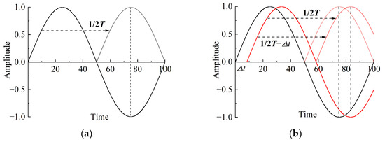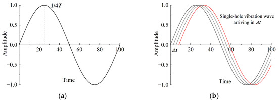 The initiation times of the above blast holes and subsequent holes are increased by a fixed duration to separate the vibration waves arriving simultaneously at the monitoring points, thereby significantly reducing the vibration caused by multi-hole blasting and addressing vibration safety concerns. Figure 2 illustrates the principle of separating vibration waves that arrive simultaneously at the monitoring points. Taking two single-hole vibration curves arriving at the monitoring points within the Δt period as an example, the figure depicts two extreme scenarios. Figure 2a shows two vibration curves arriving at the monitoring points at the same time. According to the principle of peak and trough superposition, translating one of the vibration curves backward by 1/2T achieves the optimal vibration reduction effect. Figure 2b shows two vibration waves arriving at the monitoring points at the beginning and end of the same period, respectively. Translating the latter vibration curve backward by 1/2T − Δt achieves the optimal vibration reduction effect. Therefore, for vibration waves arriving within the Δt period, the range of translation on the x-axis is [1/2T − Δt, 1/2T]. To enhance the convenience of the method, this paper stipulates the use of 1/2T as the additional time length required to separate vibration waves arriving simultaneously at the monitoring points.