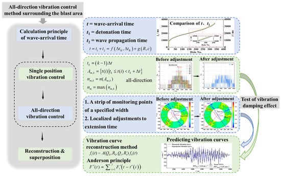To solve the above problems, this paper is conducted under the premise of a predefined initiation sequence, which can be determined using vibration wave misalignment superposition techniques or other established methods. Building upon this foundation, localized adjustments are made to vibration waves arriving at monitoring points within the same time window. By systematically shifting the initiation times of subsequent blast holes, this approach achieves vibration reduction while effectively preserving the fragmentation performance of the original delay scheme. Specifically, a computational method is established to determine the arrival times of vibration waves from each hole to the monitoring points based on the spatiotemporal relationship between blast holes and monitoring points. This enables the identification of the number of vibration waves arriving at the monitoring points within the same time window and the corresponding hole indices. The vibration waves in the same time window with excessive concurrent arrivals (clustering arrival period) are adjusted by modifying the initiation delays of the relevant holes. Subsequently, the reconstructed single-hole vibration curves are superimposed according to the revised arrival sequence to obtain the predicted vibration curve for multi-hole blasting. Furthermore, to investigate vibration control across different spatial locations, a dense array of monitoring points is deployed around the blasting area, and the arrival times of vibration waves from all blast holes to each monitoring point are exhaustively calculated. The maximum number of concurrent vibration wave arrivals at each monitoring point and their corresponding locations are statistically analyzed. Finally, the initiation times of blast holes corresponding to the clustering arrival periods at high-probability vibration risk locations are adjusted to achieve comprehensive vibration control across all directions.