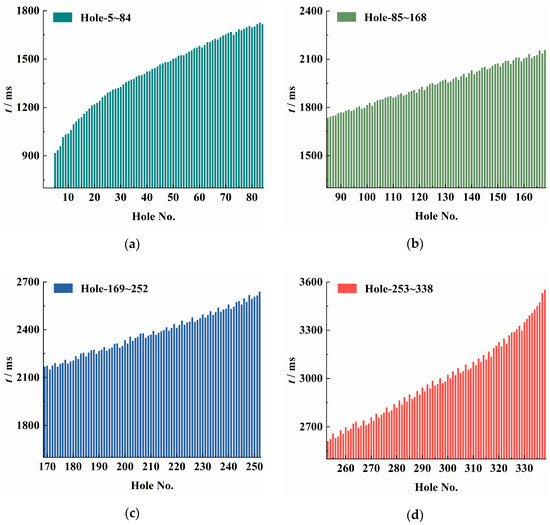 Time of arrival of the vibration waves from each hole at monitoring point B1. (a) Hole-5~84. (b) Hole-85~168. (c) Hole-169~252. (d) Hole-253~338.