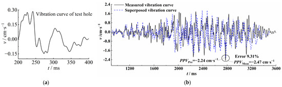 This paper primarily investigates the influence of the spatiotemporal relationship between monitoring points and blast sources on wave arrival times, as well as the associated vibration control issues. The reconstruction of single-hole vibration waves and the prediction of multi-hole vibrations serve as validation steps for vibration control effectiveness. Taking monitoring point B1 as an example, Figure 8a shows the measured single-hole vibration curve, with a dominant frequency of 9.94 Hz obtained through Fourier transform, corresponding to a half-period (1/2T) of approximately 50 ms. Using this as the baseline curve and following the methodology outlined in Section 2, the predicted multi-hole vibration curve is generated. A comparison between the predicted and measured vibration curves is presented in Figure 8b, where the initial 830 ms segment corresponds to the single-hole vibration curve of the test blast hole and is not displayed. The high degree of agreement between the two curves demonstrates that the waveform prediction accuracy based on the superposition method meets the requirements for engineering applications.