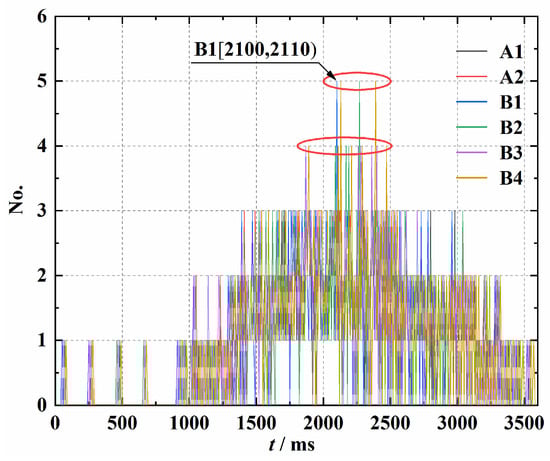 Analysis revealed significant wave clustering between 2000–2500 ms, with monitoring point B1 recording up to five simultaneous arrivals during the [2100,2110) interval (Figure 9). This phenomenon directly correlated with the local velocity peak visible in Figure 8b. The source locations of these five waves relative to B1 are shown in Figure 10. The observed spindle-shaped waveform (Figure 8b) emerges from distinct temporal patterns: the initial 0–1300 ms period typically contains ≤ 2 simultaneous arrivals, while the middle-late phase (1300–3100 ms) regularly features ≥ 3 overlapping waves.
