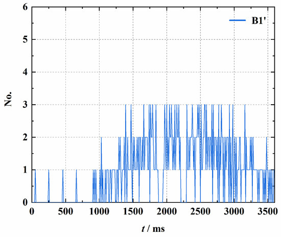 The monitoring point arrival time sequence was quantitatively analyzed using the method described in Section 2.2. The complete arrival duration was segmented into consecutive 10 ms intervals, dividing the 3600 ms period into 360 discrete time windows ([0,10), [10,20), …, [3590,3600]). Each of the 338 blast hole arrivals was assigned to its corresponding interval, enabling statistical analysis of the number of arrivals in each time interval. Figure 9 presents the arrival wave counts per interval across monitoring points.