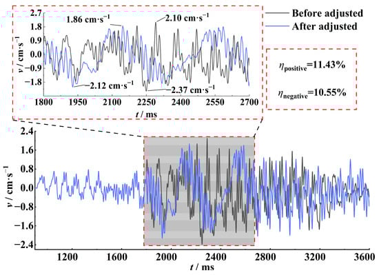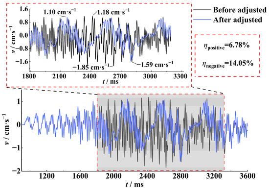 Figure 11 illustrates the number of wave arrivals at monitoring point B1 within each time period after the adjustment. It can be observed that the maximum number of simultaneous wave arrivals at the monitoring point is reduced to three. The reconstructed single-hole vibration curves are superimposed according to the adjusted arrival times to obtain the predicted multi-hole vibration curve, which is then compared with the pre-adjustment predicted vibration curve, as shown in Figure 12. The fixed time intervals for the arrival times of blast holes #109 and #163 start at 1800 ms and 2120 ms, respectively. To separate the four and five simultaneous wave arrivals, additional delays of 150 ms and 200 ms were applied. Given the single-hole vibration curve length of 200 ms, the predicted vibration curve within the range of 1800 ms to 2670 ms is extracted. Beyond 2670 ms, the amplitude of the multi-hole vibration curve is unaffected by the adjusted blast holes, and the original vibration curve is shifted backward by 350 ms. Within this time range, the peak positive vibration velocity before adjustment was 2.10 cm·s−1, which decreased to 1.86 cm·s−1 after adjustment, with a reduction rate of 11.43%. The peak negative vibration velocity before adjustment was −2.37 cm·s−1, and it decreased to −2.12 cm·s−1 after adjustment, with a reduction rate of 10.55%. The root mean square (RMS) value of the vibration wave reflects the energy of the signal and is an important indicator for measuring the signal strength. The RMS values before and after adjustment were 0.84 cm·s−1 and 0.69 cm·s−1 respectively, representing a decrease of 17.86% compared with the value before adjustment.