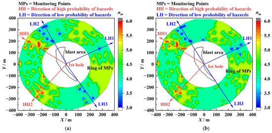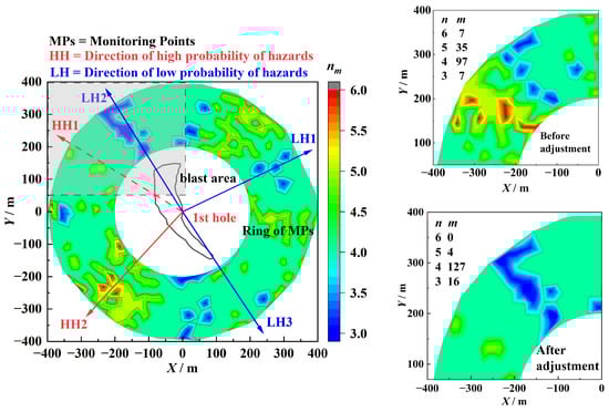Figure 13 shows concentrated red zones along the HH1 and HH2 directions, indicating a higher number of simultaneously arriving vibration waves (≥5 waves) within specific time windows at these locations. This multi-wave superposition effect significantly increases vibration amplitude, thereby elevating the probability of vibration hazards, with the HH2 direction precisely corresponding to the azimuth of monitoring points A1 and A2. In contrast, three directions (LH1, LH2, and LH3) exhibit low-probability vibration hazard characteristics, with monitoring points B1–B4 all located near the LH2 direction. When using the free face normal direction (LH1) as reference, the spatial distribution shows that HH1 and HH2 are situated in the lower-left and lower-right quadrants of the blast area respectively, while LH2 and LH3 are distributed on the left and right sides, respectively. Figure 14 presents analysis results after adjusting the initiation sequence based on monitoring point B1, demonstrating that adjustment focusing solely on this direction still leaves residual hazards and may lead to underestimation of vibration risks. To achieve comprehensive perimeter vibration control around the blast area, targeted adjustment must be implemented for high-probability hazard directions (such as the zones containing monitoring points A1 and A2).