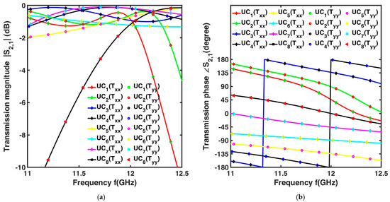 The CST Studio suite software (2023 version) is employed to simulate the magnitude (Txx and Tyy), and the phase (∠Txx and ∠Tyy), of the transmission coefficient for co-polarized signal components xx or yy, respectively, for each of the eight UCs. These transmission coefficients correspond to the scattering parameter magnitude |S2,1| and phase ∠S2,1 between ports 1 and 2, respectively. Moreover, due to symmetry, the x- and y-polarized transmission coefficients are identical. UC boundary conditions are applied in Floquet port configuration, along the x and y directions, as illustrated in Figure 2, to simulate an infinite array. The open boundaries are imposed along the z direction. The Floquet ports along the z-axis are used for exciting plane waves.