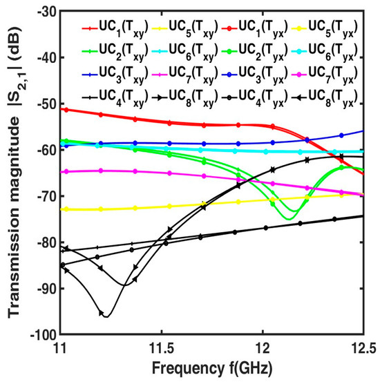 The obtained results for the different UCi are plotted in Figure 3a. The highest transmission loss, obtained at the frequency f0 = 12 GHz, is αT = 1.23 dB, corresponding to UC6. From Figure 3b, it can be observed that, at the frequency f0, eight UCs cover the 3-bit phases required for co-polarized components. Moreover, in the TA design, it is important to investigate the performance of the UC for different incidence angles θ. For this purpose, the transmission magnitude and phase for the co-polarized components are simulated for different incidence angles θ. Figure 4a shows the transmission loss αT for co-polarized components is less than 1.9 dB at for an incidence angle θ = 30°. Figure 4b illustrates the transmission phases ∠Txx and ∠Tyy of co-polarized components at f0 = 12 GHz. For θ = 30°, the transmission phase is close to the value obtained at θ = 0° with a maximum simulated displacement of about △P = 20°. In all cases, the UCs will transmit the incidence ray in the proper direction with low transmission loss. The behavior of these UCs for cross-polarized components xy, yx is also investigated. The transmission magnitude Txy and Tyx as a function of the frequency f for the cross-polarized components of these UCs are plotted in Figure 5. The highest transmission magnitude value among all these cross-polarized components is Tmax = − 51 dB which is very low.