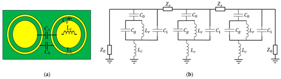 The ECM of the UC was developed using the same principle followed in the literature [45] for a better understanding of its operation. Then, it was simulated with Advanced Design System (ADS) software (2023 version). The simulated S parameter values of ADS software (2023 version) were compared with those obtained by the CST simulation. Figure 6 shows two adjacent UCs and the ECM. Starting from the UC geometry, the inductive and the capacitive behavior of the different parts of the metallic pattern are represented by means of discrete component as capacitors or inductors. In particular, the inductances of the inner circular metal portion and the outer ring are modeled by inductors Lc and Lr, respectively. The gap between the metal circle and the outer ring is represented by a capacitor Cg. The capacitance formed between the metallic circles of two adjacent cells is represented by C1. Similarly, the capacitance formed between the outer metal rings of two adjacent cells is represented by C0. The substrate is modelled using transmission line theory. It is modeled as a transmission line having an impedance of , where is the characteristic impedance of free space and is the relative permittivity of the substrate.