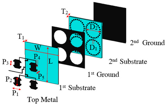 Feed antenna array stack up with dimensions (P1 = 7.70 mm, P2 = 7.70 mm, P3 = 2.75 mm, P4 = 1.44 mm, P5 = 2.18 mm, D1 = 0.62 mm, D2 = 15.05 mm, T1 = 0.381 mm, T2 = 1.575 mm, L = 35 mm, W = 35 mm); metal portion and substrate 1 and 2 are represented by black and blue colors, respectively.