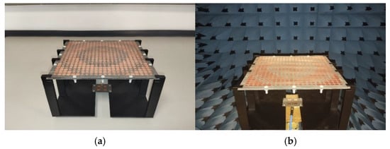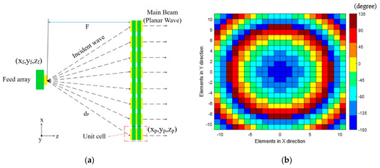 A 22 × 22 sized TA is designed and implemented using the proposed UC. As a result of this design approach, the width of the TA is D = 22 × 8.65 mm = 190.3 mm and the focal distance is F = 0.6 × D = 114.18 mm. The transmission phase of the UC of the TA needs to be adjusted to steer the beam in the desired direction. The phase adjustment of the UC compensates the spatial phase delay, which is introduced due to the distance, dp, between the feed antenna and the corresponding pth UC (see also Figure 9a). For optimal beam forming in the targeted direction, (, ), the required phase shift across the TA is computed as follows. The phase of the transmitted electric field for the pth UC is [47]: