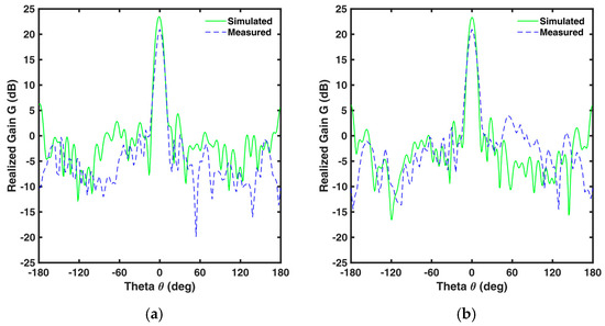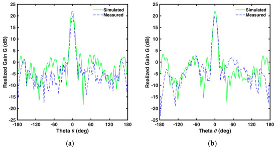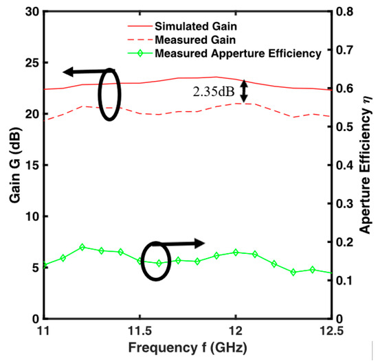 The TA design outlined above does not take in account the feed’s primary pattern, the phase discretization, transmission losses, or mutual coupling of the UC. To accurately assess these effects, full wave simulations with CST have been carried out. We fabricated and characterized the TA. Figure 10 presents the fabricated prototype and anechoic chamber measurement, with results compared to simulations. Figure 11 shows the simulated and measured peak gain of the feed antenna without TA and with TA conditions along with the measured aperture efficiency. It is observed from Figure 11 that the simulated realized peak gain is Gs0 = 23.35 dB, whereas measured peak gain is Gm0 = 21 dB at f0 = 12 GHz. At f1 = 12.4 GHz, the peak gain of this TA for simulation and measurement are Gs1 = 22.46 dB and Gm1 = 19.97 dB, respectively. The highest aperture efficiency is ηmax = 19% at f2 = 11.2 GHz, whereas it is η0 = 17% and η1 = 13% for f0 = 12 GHz and f1 = 12.4 GHz, respectively. It is observed that the 1 dB gain bandwidth is BWg = 10.8% (11.1–12.4 GHz). Figure 12 and Figure 13 show the radiation pattern at f0 = 12 GHz and f1 = 12.4 GHz, respectively for E and H plane. The measured peak gains at f0 = 12 GHz and f1 = 12.4 GHz are △G0 = 2.35 dB and △G1 = 2.03 dB, less than the simulated gain for both E and H plane, respectively. This difference can be ascribed to larger insertion loss, due to thin air layer in between the substrates that have not been bonded together with prepreg, and other fabrication tolerances. The measured peak side lobe levels are SLL0 = −20.8 dB and SLL1 = −18.5 dB for f0 = 12 GHz and f1 = 12.4 GHz, respectively.