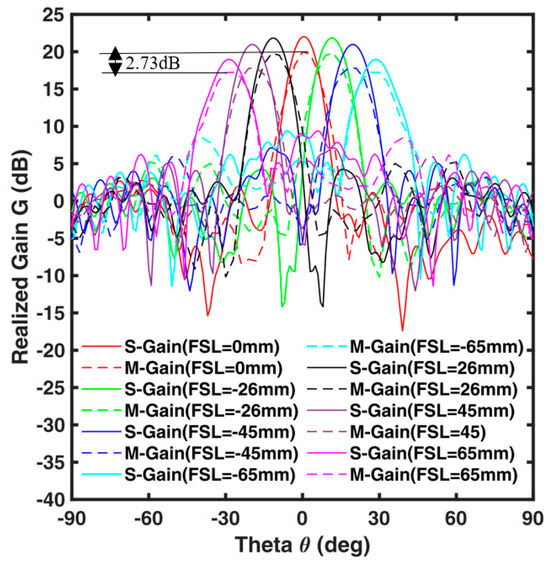The beam-steering performance of the TA is investigated by moving the SIW-based 2 × 2 patch array feed antenna. The feed antenna is shifted along the x-axis (axis shown in Figure 9a) by a feed shifting length (FSL) of 65 mm in both positive and negative directions. The farfield gain patterns for the feed coordinates (x, y) = (0 mm, 0 mm); (x, y) = (+26 mm, 0 mm); (x, y) = (+45 mm, 0 mm); (x, y) = (+65 mm, 0 mm); (x, y) = (−26 mm, 0 mm); (x, y) = (−45 mm, 0 mm); (x, y) = (−65 mm, 0 mm) are plotted in Figure 14 and Figure 15 for f0 = 12 GHz and f1 = 12.4 GHz, respectively. The qualitative agreement between the simulated and measured patterns is excellent. The beam-steering angles γmax = ±30°, γ2 = ±20°, and γ1 = ±11° are achieved.