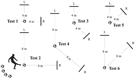 Test 1—There was a 90-degree angle between rebound boards and the distance from each board to the player’s starting central position was 4 m (Figure 1). Players started with a right foot pass to the right-hand board, then controlled the ball with one touch using the inside of the left foot followed by a pass with the same foot to the left-hand board. After this, player’s controlled the ball with one touch using the inside of the right foot then passed with same the foot to the right-hand board. The test continued until the 45 s elapses.