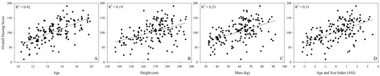 Overall passing performance (PCP1) based on all tests was significantly positively associated with age (R2 = 0.42, t = 10.67; p < 0.001), height (R2 = 0.19, t = 6.13; p < 0.001) and mass (R2 = 0.23, t = 6.90, p < 0.001) (Figure 2). A player’s age and size index (ASI) was also significantly positively associated with their overall passing performance (R2 = 0.31, t = 8.29, p < 0.001) (Table 1).