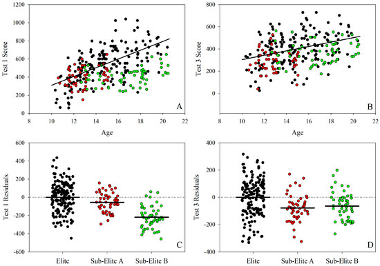 Comparison of passing performances in two passing tests among three soccer clubs—one elite (black dots) and two sub-elite academies (red and green dots). Panel (A) and panel (B) show the relationship between age and performance on test 1 and test 3, respectively. Regression lines in panel (A) and panel (B) were estimated using data from the elite academy only. Panel (C) and panel (D) show the residuals calculated from panel (A) and panel (B), respectively. Solid black lines in panel (C) and panel (D) indicate group means.