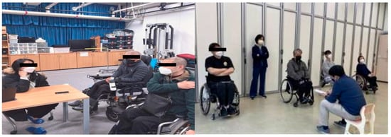 The pilot test was conducted by having the participant use the manual wheelchair equipped with the two-way propulsion system and experience both propulsion methods (Figure 10). Before the test, the participant was given a 3 min practice session to become familiar with the wheelchair and the pulling method. The participant then propelled the wheelchair along a straight 10 m path, completing five round trips for each propulsion method, for a total of ten round trips. The participant independently switched between the two propulsion methods by operating the lever on the two-way propulsion system.