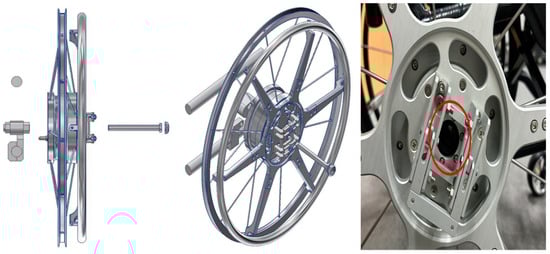 The two-way propulsion system consists of a gear slider, a forward drive gear, a reverse drive gear, a main shaft, a mode switching lever, a pushrim, and spokes. Six spokes connect the pushrim to the power transmission unit, which consists of the gear slider, two gears, the main shaft, and the mode-switching lever. When the two-way propulsion system is attached to the wheel, the rotational force applied to the pushrim is transmitted to the wheel through the gears. It is mounted to the wheelchair wheels using standard quick-release axles, which allow for easy attachment and detachment (Figure 5). One system is mounted on each wheel, so two systems are required for a complete wheelchair. The two-way propulsion system weighs approximately 2 kg, and, since two systems are required—one for each wheel—a total of 4 kg is added to the manual wheelchair. For clarity, only one system is depicted in the following figures.