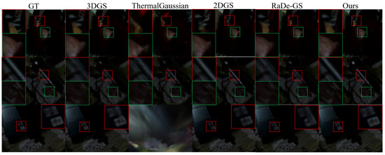 In recent years, although some thermal image methods based on NeRFs have been proposed [53,54,55,56,57,58,59,60], attempting to leverage strong modeling capabilities of NeRFs to handle thermal image data, the inherent slow rendering speed and implicit scene representation of NeRFs still constrain the practical effectiveness of these methods. With the widespread application of 3DGS methods, there have also been emerging thermal image methods based on Gaussian Splatting (GS) models [61,62,63,64]. However, most of these methods mainly focus on novel view synthesis under normal lighting conditions and fail to fully exploit the potential of thermal imaging in low-light environments.