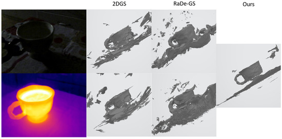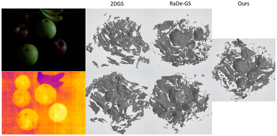 To evaluate the effectiveness of TGA-GS for 3D reconstruction under low-light conditions, we conducted experiments on two scenes, Fruits1 and Cup, using 2DGS [94] and RaDe-GS [95] methods to reconstruct 3D models from low-light RGB and thermal inputs. As illustrated in Figure 5 and Figure 6, the leftmost column displays the input low-light RGB and thermal images for each scene. The middle columns show reconstruction results from 2DGS and RaDe-GS, with the upper row representing RGB-only reconstructions and the lower row thermal-only reconstructions. The rightmost column presents TGA-GS’s multi-modal (RGB+thermal) reconstruction results.