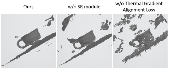 In our ablation study, we evaluate two core components of TGA-GS: the Thermal Gradient Alignment Loss and the SR module, as demonstrated in Table 3 and Table 4 and Figure 7. Table 3 and Table 4 reveal that the SR module significantly impacts rendering quality due to its direct influence on the final output. While the Thermal Gradient Alignment Loss, as an intermediate training constraint, also affects rendering results, its performance gaps can be mitigated by the SR module during post-processing. Conversely, Figure 7 illustrates that the SR module has minimal effect on reconstruction quality, whereas the Thermal Gradient Alignment Loss plays a critical role in determining geometric fidelity. This discrepancy arises because the SR module operates as a post-processing component, leaving the core reconstruction process of TGA-GS largely unaffected. In contrast, the Thermal Gradient Alignment Loss imposes structural constraints during training, directly shaping the 3D geometry optimization.