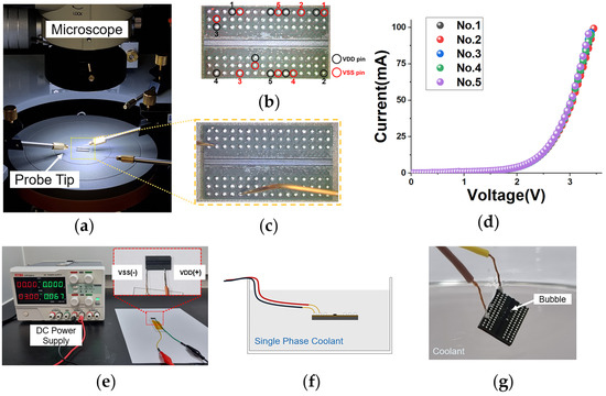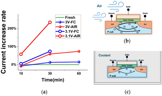 Figure 6b]. In contrast, in the immersion cooling environment, the heat generated by electrical stress was dissipated more effectively, minimizing further increases in leakage current and enhancing the reliability of the semiconductor package [