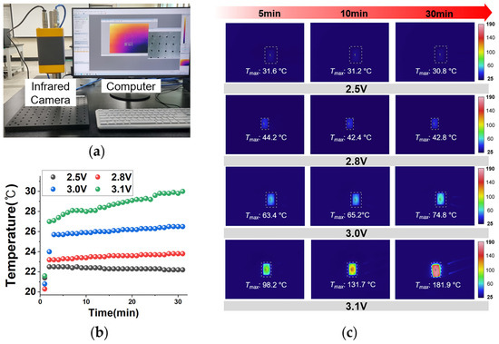 Figure 3c]. However, a relatively rapid initial increase in package temperature was observed. At 2.5 V, the temperature initially increased by 1.1 °C, then began to decrease after 7 min. At 2.8 V, the temperature initially increased by 2.9 °C, followed by an additional rise of 0.1 °C at 10 min and 0.5 °C at 30 min, based on the 5 min measurement interval. At 3.0 V, the temperature initially increased by 4.9 °C, with further increases of 0.2 °C at 10 min and 0.8 °C at 30 min. At 3.1 V, the temperature initially increased by 5.4 °C, then rose by 0.3 °C at 10 min and 2.2 °C at 30 min [