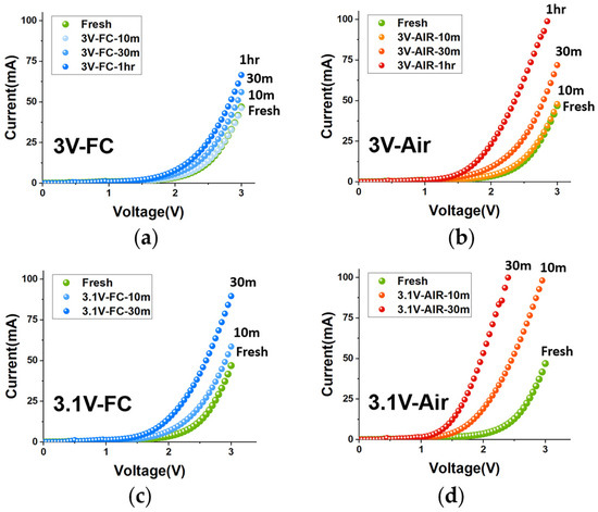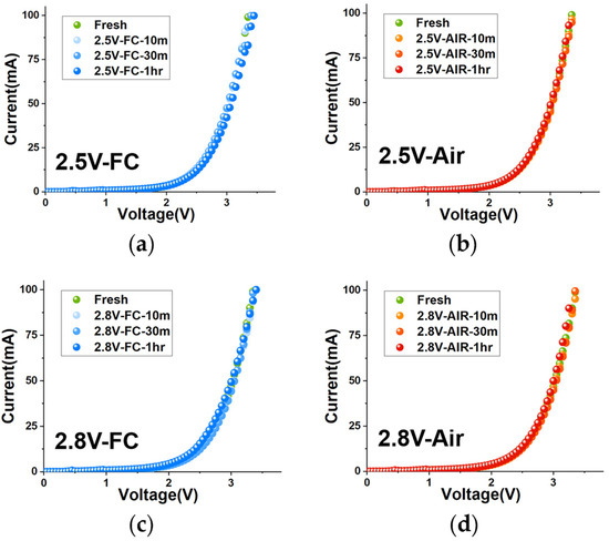 21], this study employed the I-V curve to characterize internal electrical degradation. At 2.5 V and 2.8 V, the electrical characteristics of the package remained identical to those of the undamaged (fresh) package up to 1 h. In the previous heat generation measurements shown in