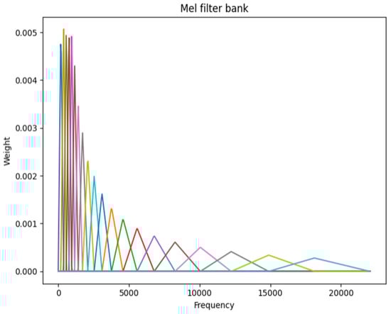 The Mel-spectrogram is a variant of the spectrogram that reflects human auditory perception. Since human sensitivity to sound decreases as frequency increases, the Mel-scale adjusts the frequency axis using a Mel-filter bank, as shown in Figure 2. Applying this filter bank to an STFT-based spectrogram yields Mel-spectrum frames for each frequency band. These frames are stacked to form a Mel-spectrogram as shown in Figure 3, which retains the essential acoustic characteristics while reducing data dimensionality.