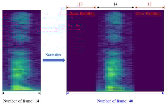 As the dataset includes audio segments of varying lengths, the number of time frames for each sample is inconsistent. To address this, zero-padding was applied to the beginning and end of each acoustic sample, as shown in Figure 6, so that all inputs had a uniform length of 40 frames.
