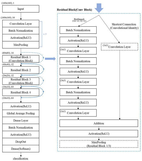 The proposed model visualizes and utilizes spectrograms, Mel-spectrograms, and MFCCs extracted from acoustic data as input for CNN-based training. The model architecture is based on a customized ResNet structure incorporating residual connections and Bottleneck blocks, as illustrated in Figure 8 and Figure 9. The Bottleneck structure is composed of sequential 1 × 1, 3 × 3, and 1 × 1 convolutional layers. It reduces the number of parameters and removes irrelevant noise while preserving essential features [19]. This structure enables efficient parameter usage even in deeper layers of the network and contributes to a lighter model design with a lower computational cost. Residual connections are implemented using convolutional blocks, which include 1 × 1 convolution layers in the shortcut paths. These connections standardize feature map dimensions and maintain compatibility between layers [14]. Pooling operations are applied selectively within the first and third Residual Blocks to prevent excessive downsampling and ensure that spatial resolution is preserved.