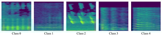 The full dataset was categorized into five distinct classes, each representing a specific type of acoustic data. Table 1 presents the number of samples used for training and testing in each class, while Table 2 summarizes the characteristics associated with each class label. Figure 11 shows example spectrogram images for each class, illustrating the differences in acoustic patterns across the dataset.
