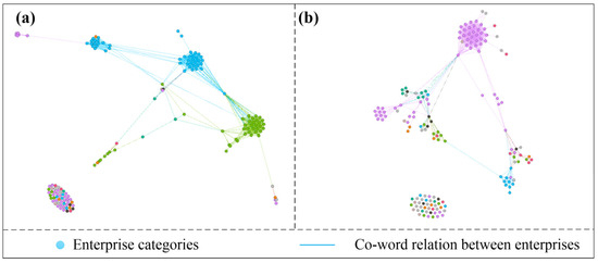 To verify the reliability of our proposed co-word relation, we randomly selected 200 enterprise data points from two datasets for visualization, as shown in Figure 3. In the figure, Figure 3a is the visualization result for the Xiuzhou District dataset, and Figure 3b is the visualization result of the Zhuji City dataset. We used nodes to represent enterprise entities, edges to represent co-word relations between enterprises, nodes of different colors to represent different enterprise categories, and then used a force-oriented layout to distribute them in the graph. The co-word relation graph we designed shows associations between most of the same type of enterprises, such as the blue and green nodes in Figure 3a and the purple nodes in Figure 3b.