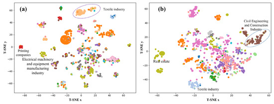 T-Distributed Stochastic Neighbor Embedding (t-SNE) is a widely used nonlinear dimensionality reduction technique that operates by minimizing the Kullback–Leibler divergence between the distributions of data points in high-dimensional and low-dimensional spaces. t-SNE is effective at preserving the local structure of the original high-dimensional data in the lower-dimensional space, making it especially advantageous for data visualization. To visually assess the model’s performance in feature learning, t-SNE was applied to the minor classification features of the Xiuzhou and Zhuji datasets after training, with the results presented in Figure 4. As illustrated in the figure, data points belonging to the same category exhibit obvious clustering patterns in the low-dimensional space. For instance, in Figure 4a, the printing industry (red) and the textile industry (orange) are clearly clustered, while in Figure 4b, the real estate industry (brown) and the textile industry (blue) form separate clusters. These results indicate that our model can effectively capture semantic features and co-word relationships, thereby enabling accurate industry classification.
