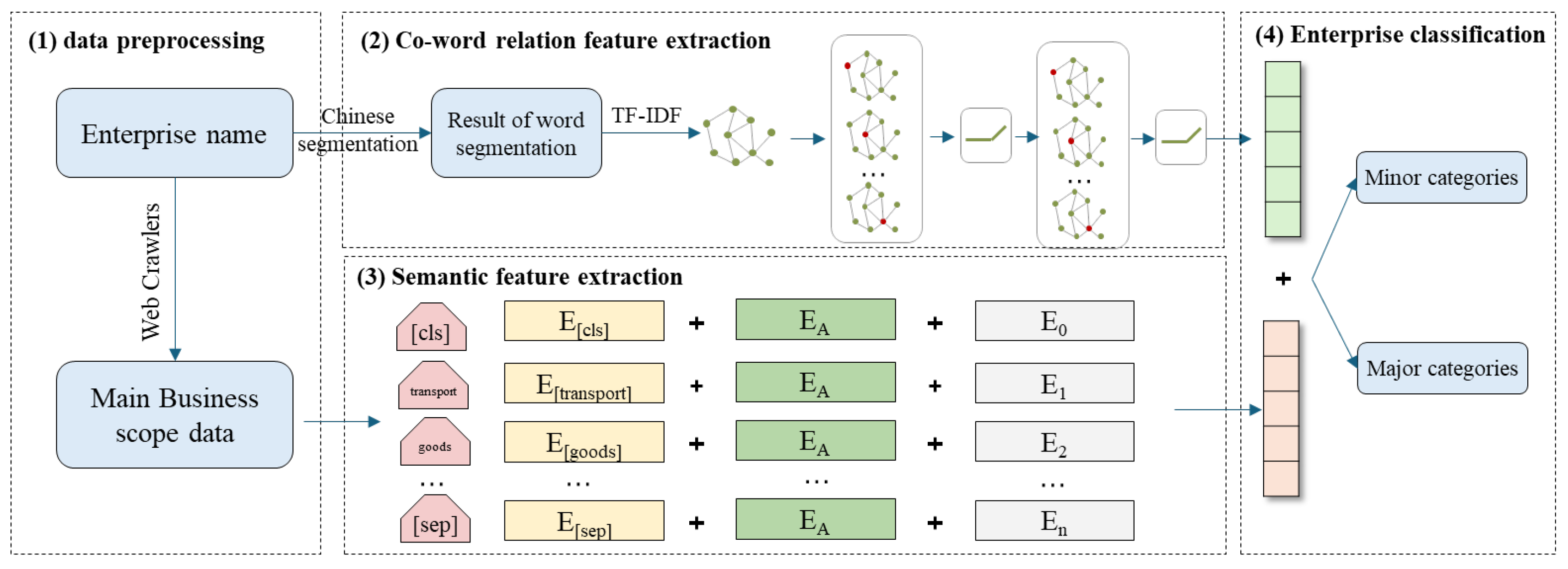 (1) The fusion and utilization of multi-source information improve classification accuracy. We construct a co-word relation graph to extract the co-word relation features. At the same time, a web crawler is used to extract the main business information of enterprises as supplementary data, and BERT is used to extract semantic features from that supplementary data. This method makes comprehensive use of multi-source information and can fully integrate the characteristics of many aspects to categorize enterprise industries.