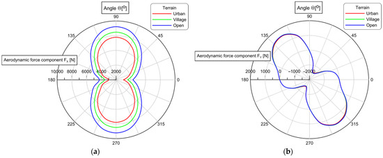 They are equal to Fx = 9220.826 N, 8,480,169 N, and 7783.727 N in the case of open, village, and urban terrain. It is worth noting that in our previous study concerning other lattice structures (scissor lift or fast-erecting crane), the extreme values of the aerodynamic forces are obtained for a slightly different position of the structure for the wind direction. However, in the current study, the jib possesses a more openwork structure in comparison with the previously mentioned ones. The minimal values of the Fx components are obtained when the crane jib is parallel to the wind direction. In this case, the aerodynamic drag force is generated only by the tower (4274.746 N, 3571.366 N, and 2998.246 N, respectively). In turn, the component Fy, Figure 8b, takes maximal values for the angle θ close to θ = 60°, and the values are as follows depending on the wind profile, namely, Fy = 1502.037 N, 1510.663 N, and 1478.181 N (absolute value). As can be seen, these values are very similar. It is caused by the fact that this component of the aerodynamic drag force is caused mainly by the rotating crane jib, while the crane tower is stationary. For the angles θ = 0°, 90°, 180°, and 270°, the value of Fy should be treated as equal to 0 N.