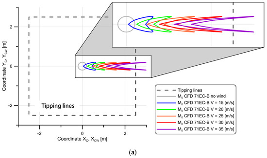 Next, the total (resultant) stabilizing and overturning moments are determined concerning the selected tipping line for the exemplary top-slewing tower crane 71EC-B. The four cases are possible. In the first case, the jib is parallel to the wind direction without payload, and the upper counterweight is against the wind. The second case is similar, but the jib carries a payload. Both these cases relate to when the crane is out of service and the slewing platform is unlocked. The third case is when the jib is parallel to the wind direction without payload; however, the upper counterweight is on the opposite side than in the previous cases. Consequently, in the fourth case, the jib is in an identical geometrical configuration as the previous one but now carries a payload. The third and fourth cases relate to when the crane is in service and the slewing platform is locked. The second and third cases are chosen for further analysis.