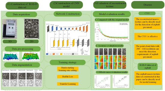 In view of this, the primary objective of this paper is to develop a novel CNN architecture for the macrotexture reconstruction of asphalt pavements based on monocular images, which in turn enables the detection of pavement skid resistance. Firstly, different gradation types of asphalt mixtures are used to establish asphalt macrotexture RGB-D dataset, a new encoder–decoder network architecture is designed to recover the depth information from asphalt macro-texture 2D images, and a series of training strategies are proposed to optimize the model. Secondly, the accuracy of the reconstructed texture is evaluated using MAE, RMSE, REL and Accuracies. Finally, the effectiveness of the reconstructed texture is analyzed based on MTD and f8 indicators, and the reconstructed texture is shown to be directly applicable for the evaluation of pavement skid resistance. The flowchart is shown in Figure 1.