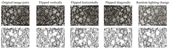 To enhance the model’s generalization ability, 365 sets of cropped RGB images were randomly divided into training samples (255 groups), test samples (73 groups) and verification samples (37 groups) in a 7:2:1 ratio. The three sample types were augmented using techniques such as mirror flipping, horizontal flipping, vertical flipping, random brightness adjustment, and noise perturbation. The results are shown in Figure 5, yielding a total of 2190 image pairs.