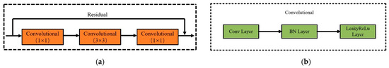 The encoder uses an improved ResNet101 as the feature extractor to downsample the input image, extract details and multi-scale features at different resolutions, and pass the feature map output by the final downsampling module to the decoder. The encoder consists of 33 residual blocks, each including convolutional layers with sizes of 1 × 1, 3 × 3, and 1 × 1. It employs skip connections to link the input feature signal with the output feature after convolution. This method preserves the original features while incorporating deeper, more complex features. The residual structure is shown in Figure 7a.