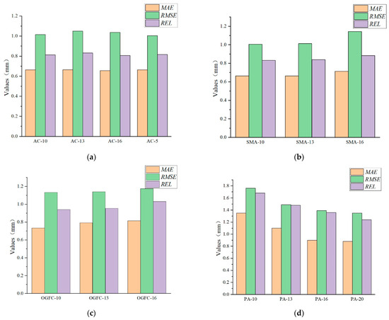As shown in Table 6, the maximum REL for the MTD field measurements was 5.15%, and the RMSE was 6.9%. At thresholds of 1, 2, and 3, the detection accuracies reached 92.76%, 95.02%, and 97.86%, respectively. While the results met the detection requirements, the errors were higher compared to those of dense-graded and semi-open-graded asphalt pavements.
