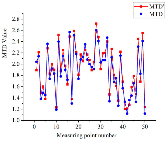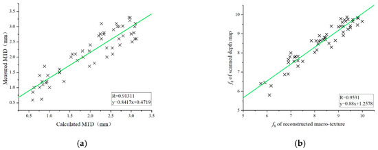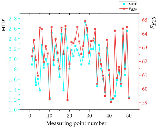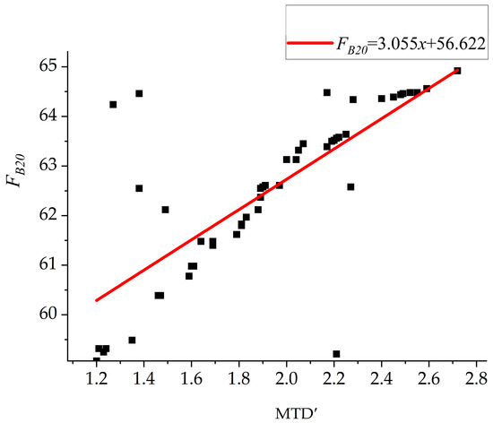 To investigate the correlation between the 3D-reconstructed MTD’ and FB20, least squares regression analysis was performed on the paired datasets. The derived relationship is expressed in Equation (25), where the independent variable x represents MTD: