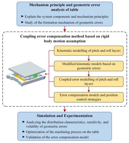 The system framework of the coupling error compensation method is illustrated in Figure 1. This study first introduces the structural configuration and operational principle of the motion platform, followed by an analysis of the geometric error generation mechanism in the pitch and roll layers that significantly influence the table’s positioning. Subsequently, coupling error modelling and compensation are implemented through the following methodology: initially establishing the kinematic model of pitch and roll layers then calibrating critical parameters in the kinematic model considering geometric errors. A coupling error model is developed based on rigid body motion assumptions, ultimately yielding the platform’s error compensation model and position control strategy. The distribution characteristics, sensitivity indices, and variation patterns of geometric errors in the pitch and roll layers are systematically investigated through numerical simulations and compensation experiments. The experimental results validate the proposed coupling error compensation approach.
