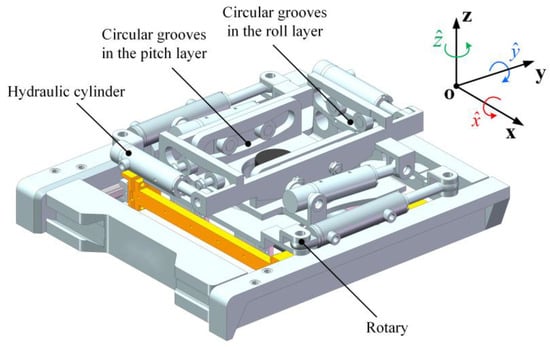 As shown in Figure 2, the table’s motion system is hydraulically driven to achieve a higher load capacity within a smaller volume. The motion axes, based on the assembly sequence, are categorized into the 1—longitudinal, 2—transverse, 3—rotary, 4—pitch, and 5—roll layers, each of which is rigidly connected and operates independently. The longitudinal and traversing layers are linear motion mechanisms consisting of hydraulic cylinders and guide rails. The rotary motion of the table is accomplished by the expansion and contraction of the hydraulic cylinders on both sides of the rotary level in opposite directions. The pitch and roll layers are both bilateral circular groove pulley mechanisms. The hydraulic cylinders on both sides of the mechanism will synchronously expand and contract to make the pulleys slide in the circular arc groove to achieve the rotation of the table. Inclination sensors are mounted on the table’s flange to monitor changes in its attitude, while the hydraulic cylinders are fitted with internal displacement sensors to detect the actual stroke.