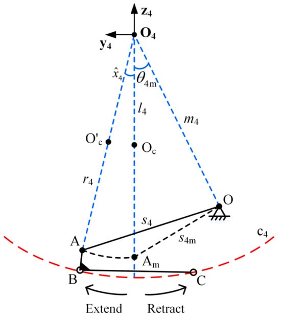 The schematic diagram of the pitching mechanism is shown in Figure 4. One end of the hydraulic cylinder is hinged at point O, and its piston rod and pulley module are hinged at point A; s4 represents the stroke of the hydraulic cylinder; O4 is the center of the circular slot; and r4 is the radius of rotation of the circular slot. Adjustment of the table’s pitch angle is achieved by controlling the movement of pulleys B and C in the circular arc groove c4. The T-slot platform’s center point, Oc, is situated on the line O4, A, at a distance l4 from O4; θ4 indicates the starting angle of the pitching mechanism; the hydraulic cylinder stroke in the starting state is s4m; and the pitch angle is 0 rad. When the stroke of the hydraulic cylinder is s4, the table rotates around the x4-axis of the coordinate system in which O4 is located, Oc moves to Oc’, and the angle between O4Oc’ and O4Oc is the pitch angle of the table.