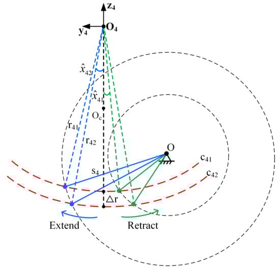 Define the contour error of the inner arc surface of the motion mechanism on both sides of the pitch layer as δ41 and δ42, and the actual rotation radius on both sides as r41 and r42, and then the difference in contour error can be expressed as ∆r4 = δ42 − δ41. An approximation of r4’ is given by r4 + 0.5∆r4, with ∆r42 being approximately equal to 0. Ignoring the motion error of the hydraulic cylinder itself, the inverse kinematics model of the pitch and roll layers can be modified as