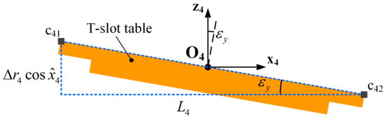 Furthermore, the process of pitching motion may induce a coupling error εy in the roll angle, attributable to the disparate contour errors on either side of the mechanism, as depicted in Figure 6. Based on the assumption that the table is a rigid body system, the coupling error of the tumbling angle is determined by the projection in the Z-direction. Consequently, the model for the coupling error of the tumbling angle can be articulated as