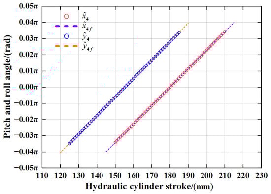 In order to facilitate the control of the table, a linear fit of Equations (14) and (15) was performed using the least squares method over the stroke range of the hydraulic cylinder, as shown in Figure 7, and the fitted positive kinematic model is: