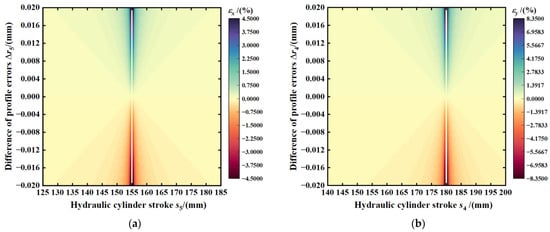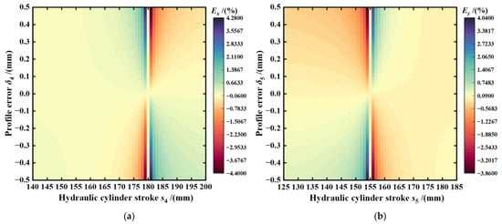 In Figure 8a, the independent error Ex exhibits two distinct boundaries when the hydraulic cylinder stroke s4 at the pitch level approaches 180 mm. These boundaries display an antisymmetric distribution on their left and right sides. The horizontal coordinate corresponding to this boundary represents the initial travel after error correction. When δ4 > 0, the initial travel is shifted 1 mm to the right; conversely, it is shifted 1 mm to the left. Similarly, the error distribution of the roll layer also exhibits such characteristics. When δ lies between −0.5 mm and 0.5 mm, the extreme values of Ex and Ey are 4.28% and 4.04% and the extreme deviations are 8.68% and 7.90%, respectively. The error trends in the heat map illustrate that the roll angle is slightly more sensitive to contour errors than the pitch angle.