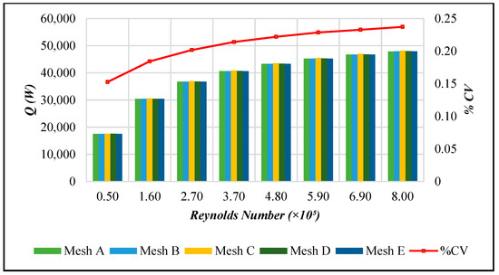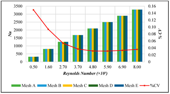 Given the complexity of the model and to ensure the correctness of solutions, a mesh sensitivity test at various Reynold numbers was conducted at various mass design points. The test evaluated the impact of the number of mesh elements in a test grid on the Nu and Q, as can be seen in Figure 1 and Figure 2. It was found that the average percent coefficient of variation between the values of Nu and Q are 0.058% and 0.209%, respectively, indicating that the model has reached mesh independence. Accordingly, Mesh A was employed in this study for simple and optimized calculation [21].